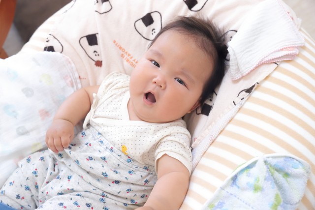 100日くらいの赤ちゃんって寝返りせず、表情も出てきて、赤ちゃんによってはお返事もしたりととっても赤ちゃんらしい時期ですね。