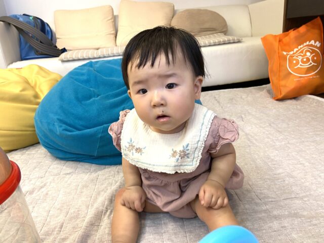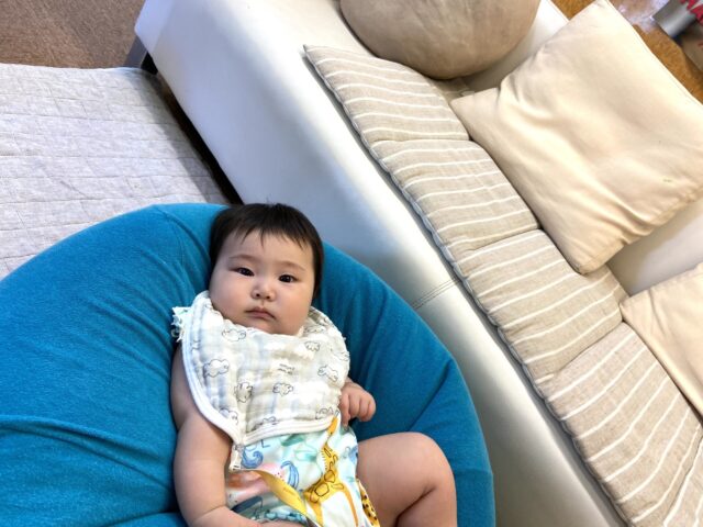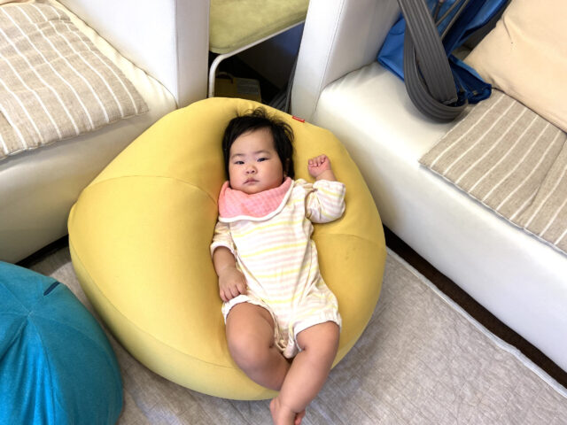 ねんね期のお子ちゃまは、クッションの上でママを待ちます。