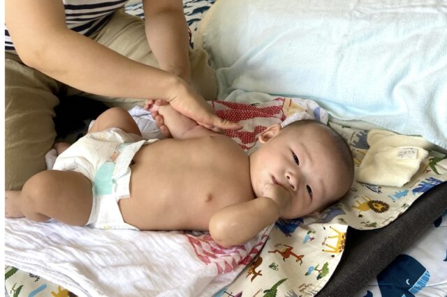 何度かお泊りに来てくれている彼は、すでに寝返りをマスターしたそう。