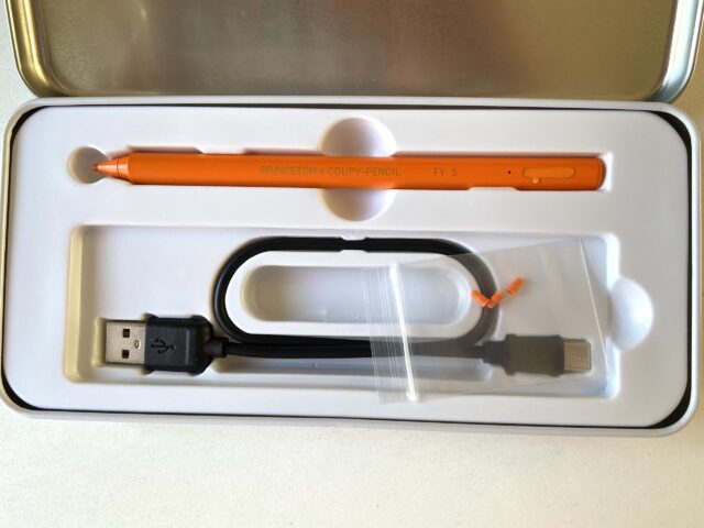 中にはクーピーペンシルそっくりのタッチペン(替え芯付き)と充電ケーブル。
