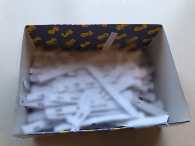 そして、お一人ずつに切り分け、抽選箱の中へ・・。