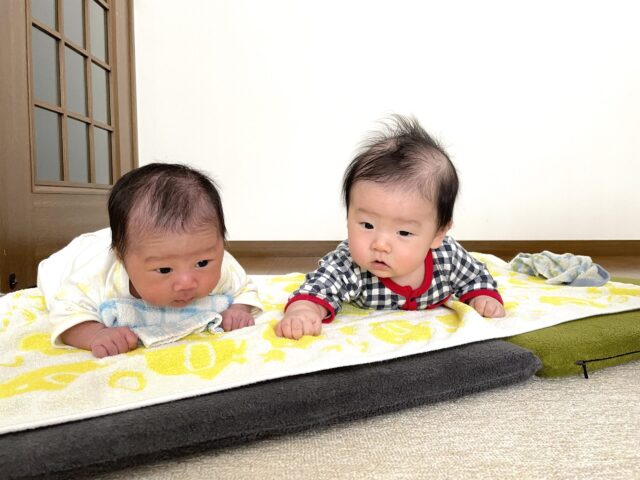 とても元気なので、2人そろってうつ伏せ運動してみました。