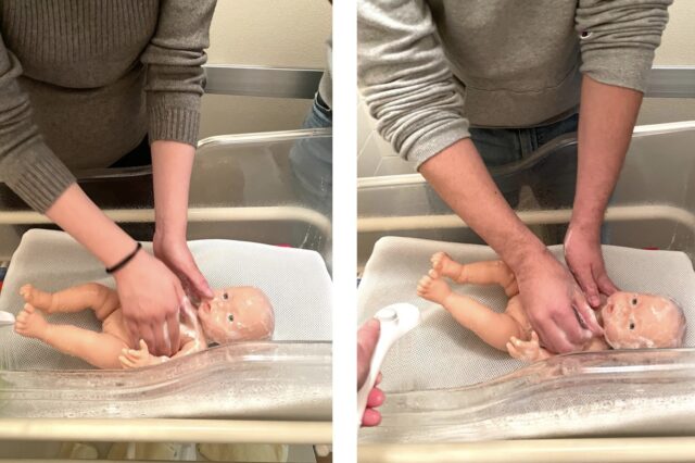 シャワー沐浴は、洗面台にマットを敷いて行うシチュエーションを想定して練習します。