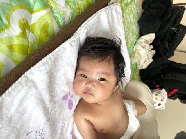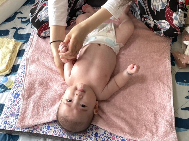 背中のマッサージで腹ばいにしたらご機嫌斜めになっちゃったけど、お家でもママとの時間楽しんでもらえると嬉しいなぁ♪