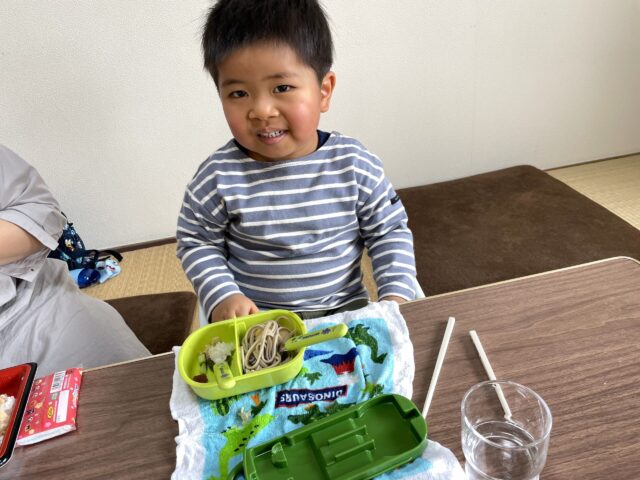 5月からプレ幼稚園に通い始めるようで、新調したお弁当箱セットをもって遊びに来てくれました。