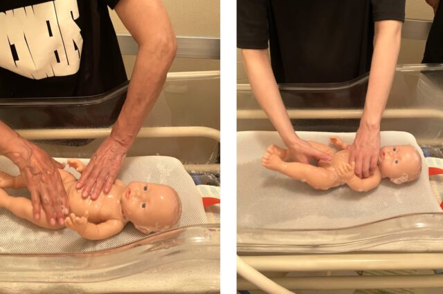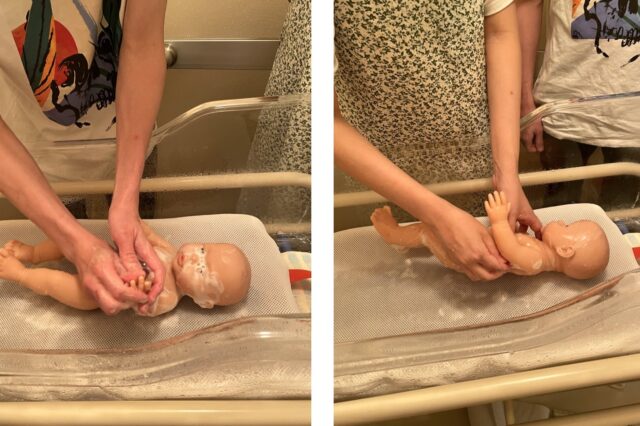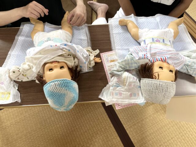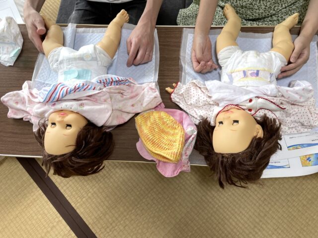 お人形も男の子と女の子がいるので、できるだけお腹の赤ちゃんの性別で練習してもらいます。