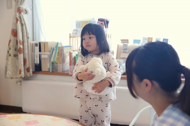 ぬいぐるみのくまさんでおむつ交換をしたり、だっこの練習をしたり大忙し・・。