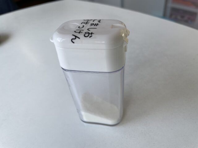さんさんでは、もとごましおのふりかけが入っていた容器に入れて使っています(笑)