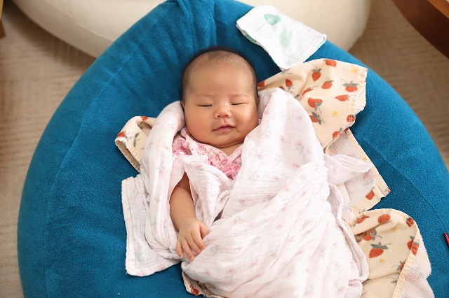 オニオンソファ(青のクッション)と新生児の白ももひきが似合うカワイ子ちゃんでした。