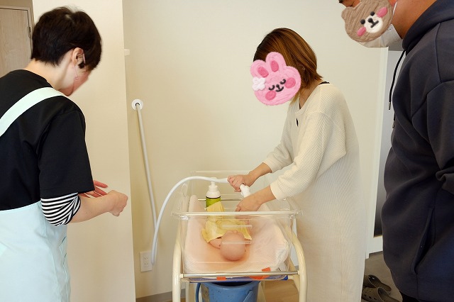 さんさん教室は少人数制なので、ママとパパどちらにもシャワー沐浴を体験してもらいます。