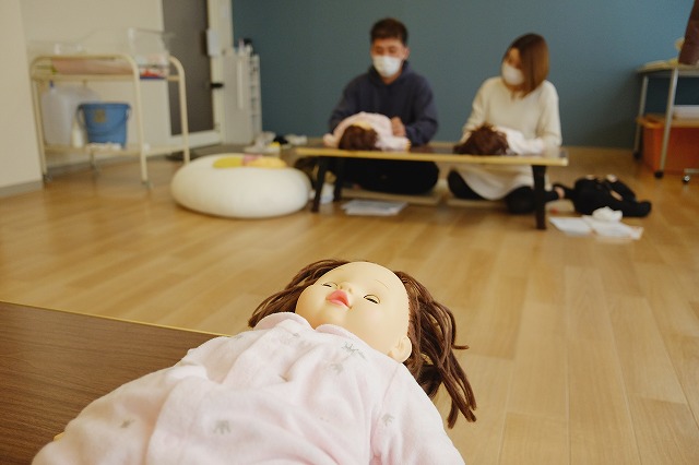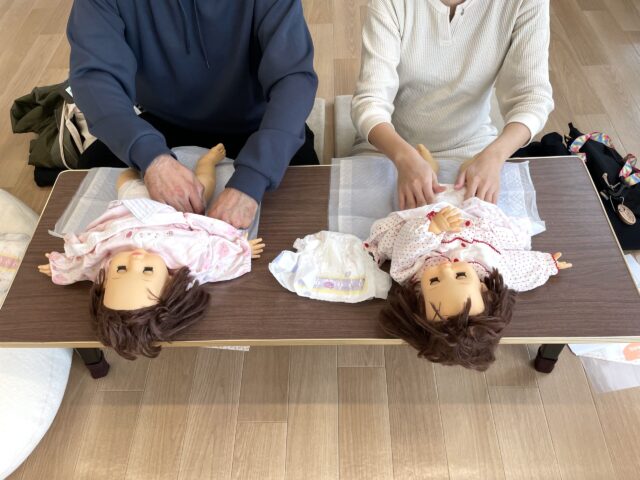その後は、お待ちかねの赤ちゃんのお世話の練習です。