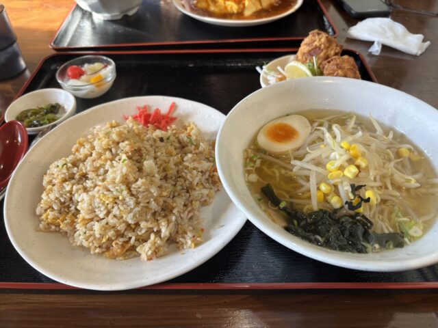 チャーハンに塩ラーメン、鶏のから揚げ2個(かなり大きめ)とデザート付きです。