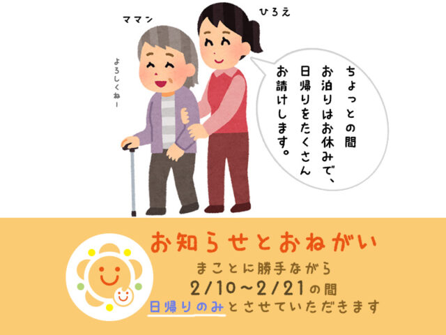 母の生活のサポートをしながらお泊りでのケアをすることが難しくなりますので、2月10日から2週間ほど宿泊での産後ケアの受け入れを休止いたします。
