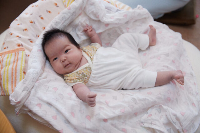 ママも疲れが取れてきて、おくるみやだっこひもにチャレンジする余裕が出てきたみたい。