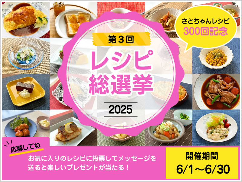 この総選挙では皆さんがさんさんで食べて美味しかった、作ってみたら好評だった、難しそうだったけどチャレンジしてみたなど理由は何でもよいのですが、好きなレシピを選んで投票するだけ!