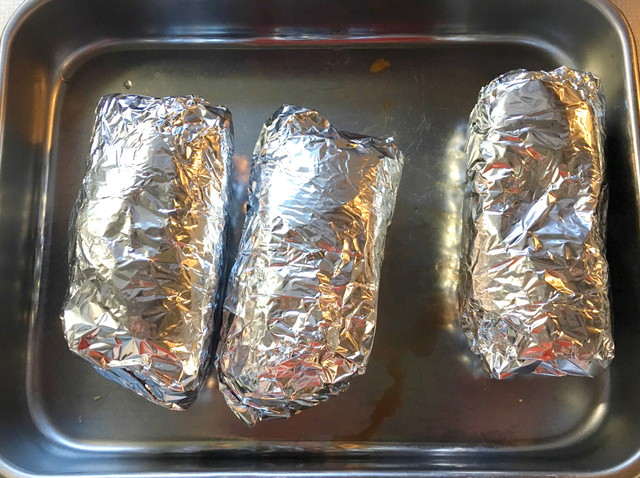 両面焼けたらアルミホイールで二重につつんで3時間程休ませます。