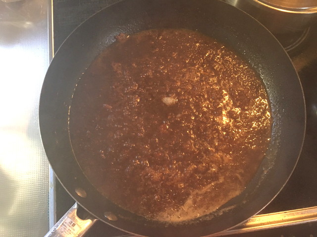 お肉を焼いた後のフライパンに材料を全て入れて、かき混ぜながら半分になるくらいまで煮詰めます。
