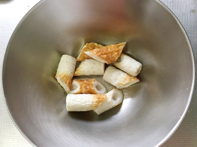 ちくわは食べやすい大きさ切りましょう。3等分位が口に入れやすいですね。