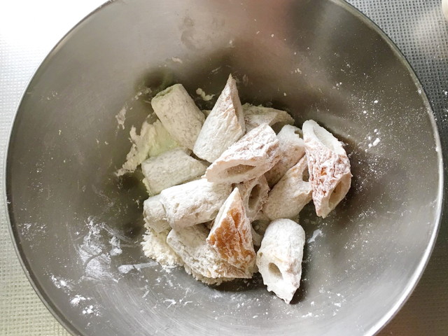 天ぷら粉を大さじ2を全体にまぶしてまんべんなく粉がいきわたるように。