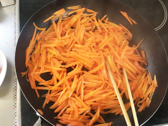 フライパンを温めて油をしいて人参を炒めます。