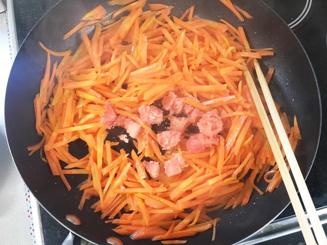 人参に油が回ったらたらこを入れます。