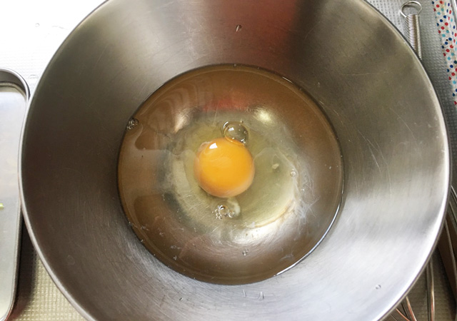 卵を一つ割入れ、水、白だしを入れてよく混ぜる