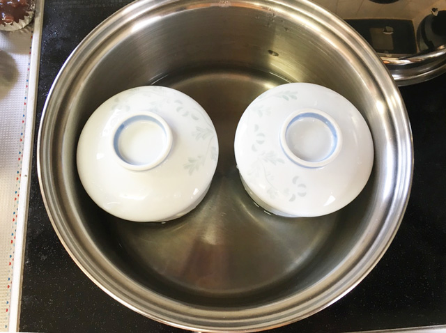 お鍋に茶碗蒸し半分くらいのお湯を沸かして、器をいれましょう。