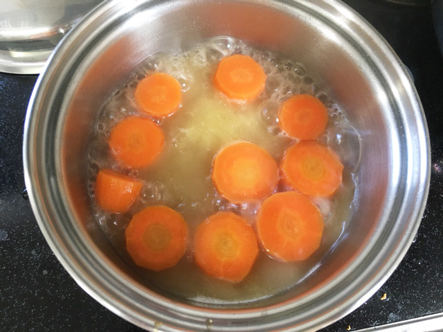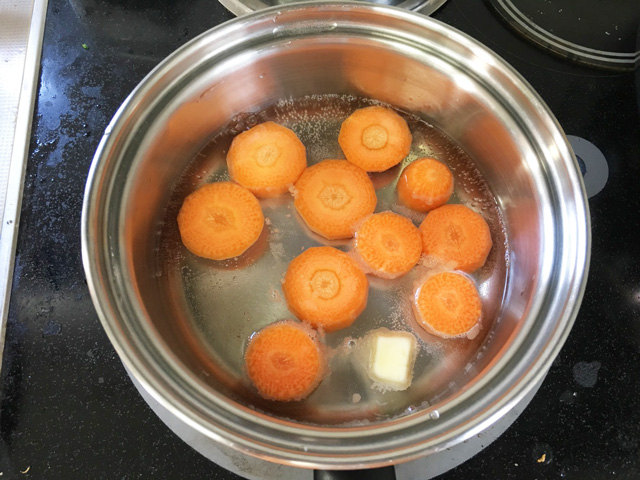 人参を輪切りにして鍋に入れ、お水を人参がひたひたになるくらい入れましょう。