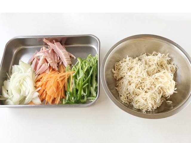 材料の野菜は千切りしておきます。