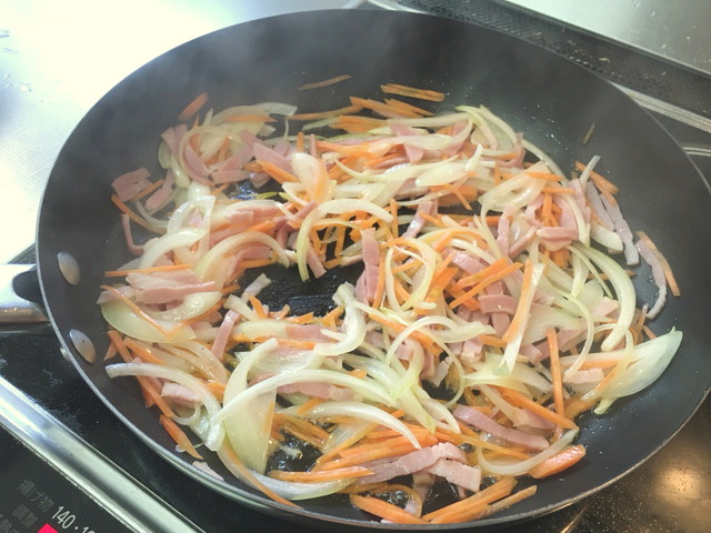 フライパンに油を入れ、ベーコン、玉ねぎ、人参の順に入れます。