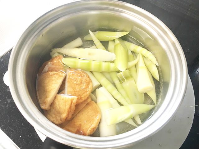 姫竹とさつま揚げを食べやすい大きさにカットし、お鍋に水、タケノコ、さつま揚げを入れます。