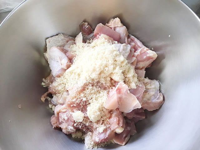 ボウルにカットした鶏モモ肉を入れ、砂糖入れて揉みます。