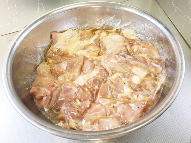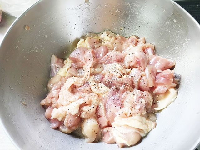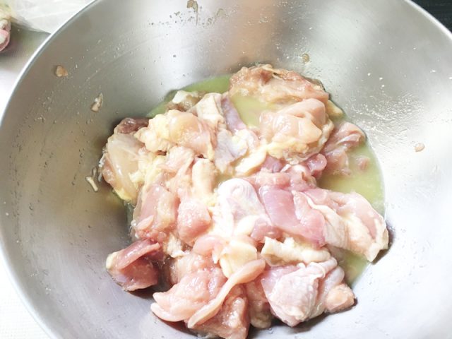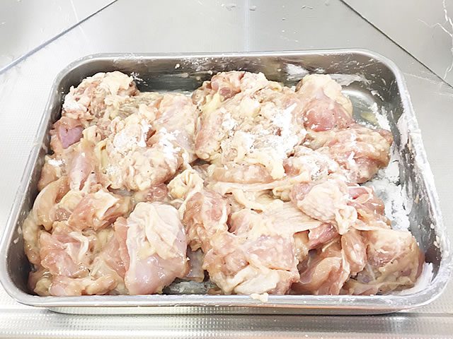 漬け込んだ鶏モモ肉全体に片栗粉をまぶします。