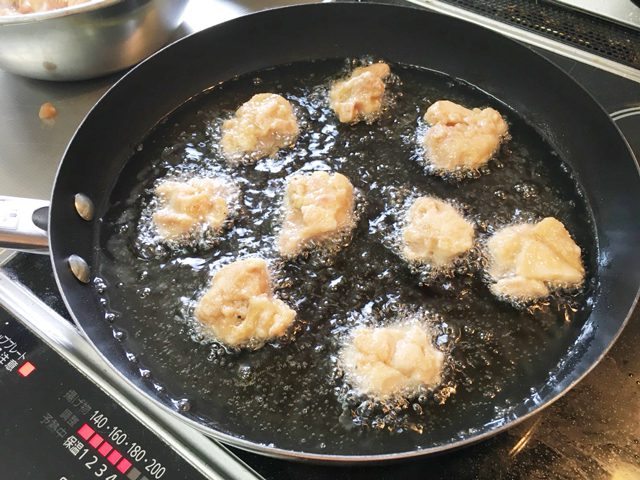 150℃~160℃くらいの低温の油の中にお肉を投入します。180℃で5分~6分くらい揚げます。