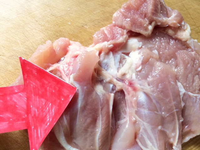 鶏肉のすじを切ります。矢印の白くて硬いところがすじです。