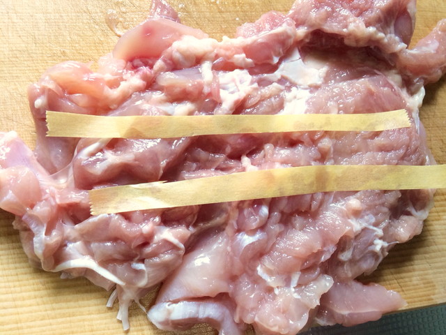 改良前のザンギではフォークを刺してすじ切りしていましたが、改良型レシピでは子供でも食べやすいようにと包丁を使って「すじ切り」をすることにしました。