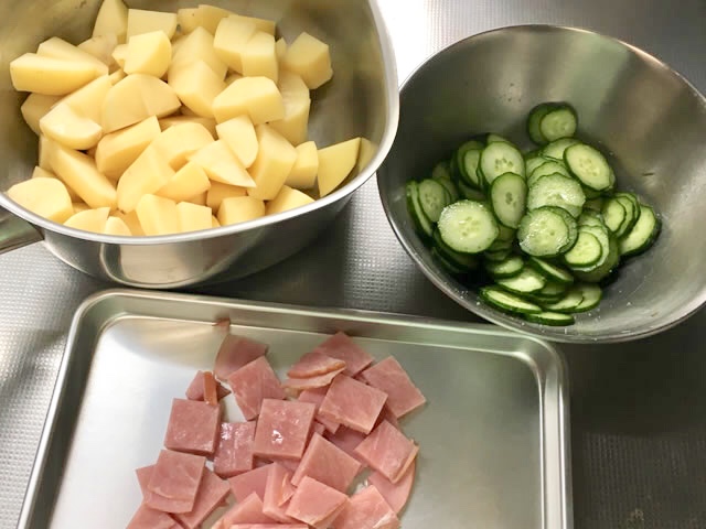 じゃがいも、きゅうり、人参、ハムをカットしましょう。