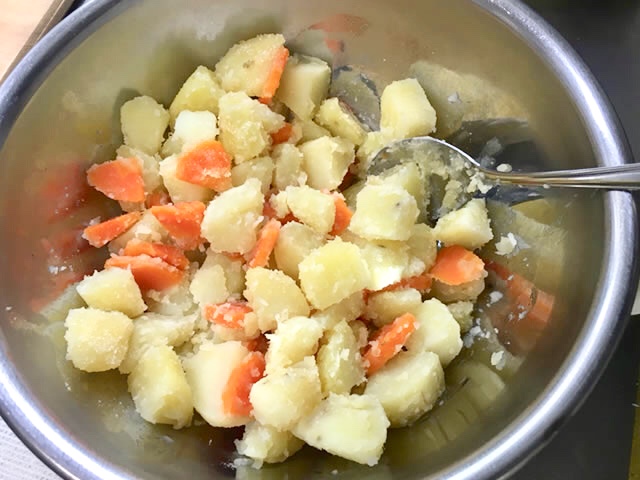 茹でたじゃがいもと人参に砂糖、粉チーズを順番に入れて混ぜます。