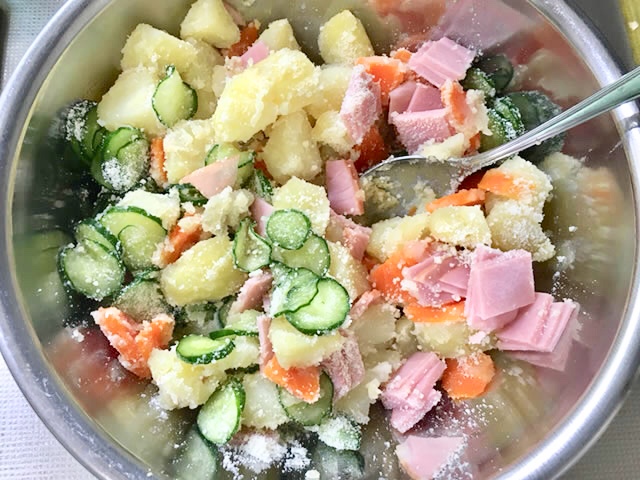 じゃがいも、人参、ハムは食べやすいように少し小さめに、きゅうりは薄くスライスします。