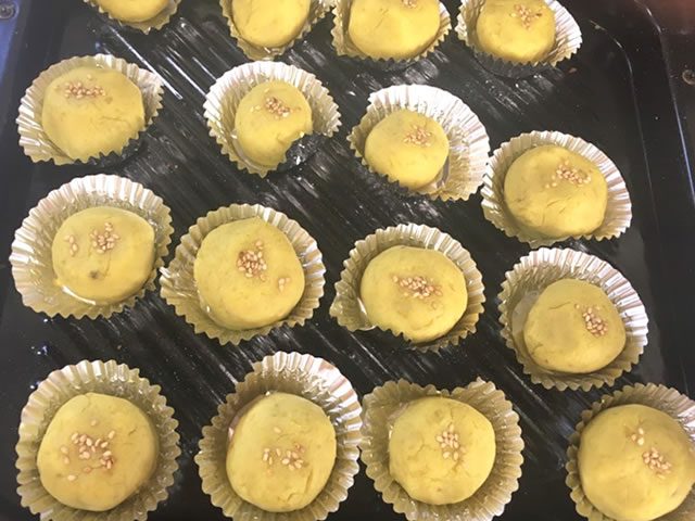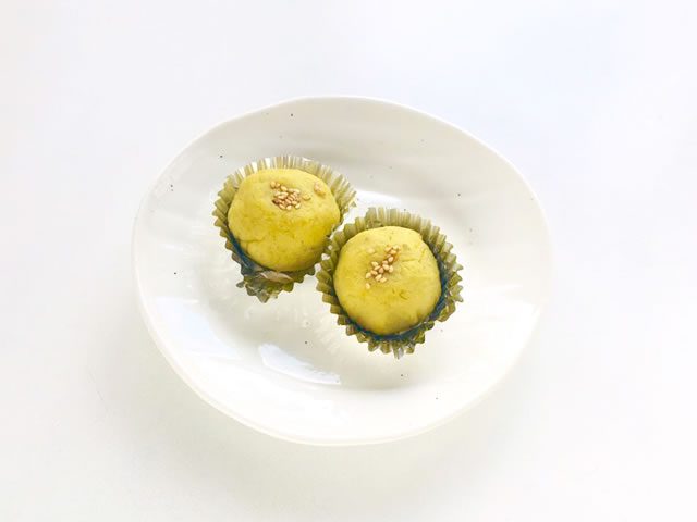 サツマイモが冷めてから食べやすい大きさに丸めて、アルミカップに乗せていきましょう。