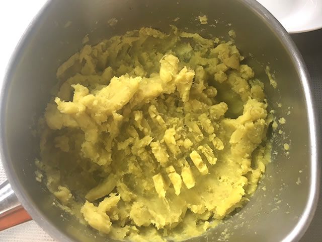 ある程度水分が飛んだら、サツマイモが温かいうちに竹へらやマッシャーなどで潰します。
