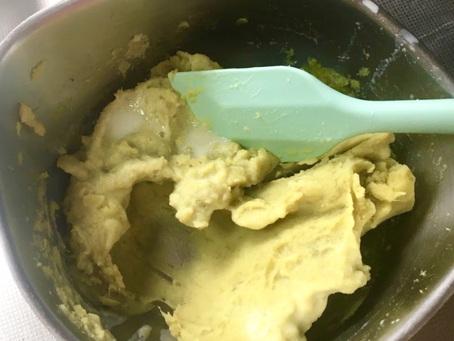 粗めに潰したら、バター、砂糖、牛乳の順番に入れてゴムベラなどで練ります。