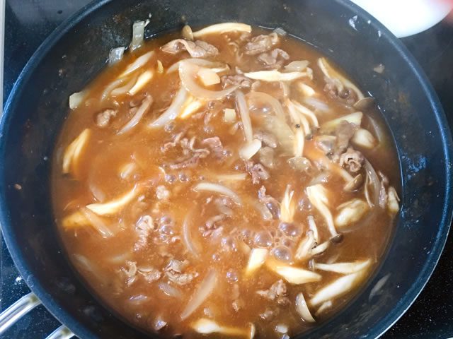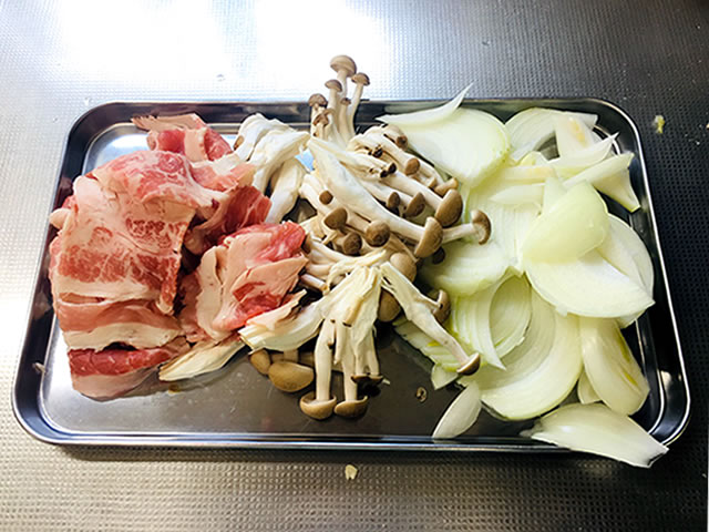 お肉と玉ねぎは食べやすい大きさにカットします。しめじは軽くほぐしておきましょう。