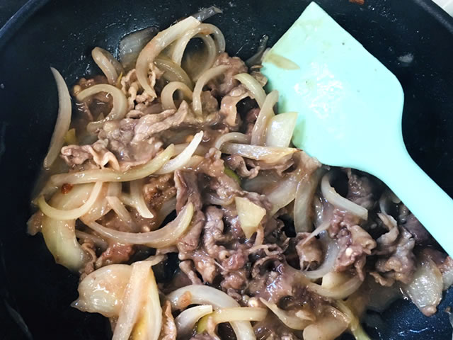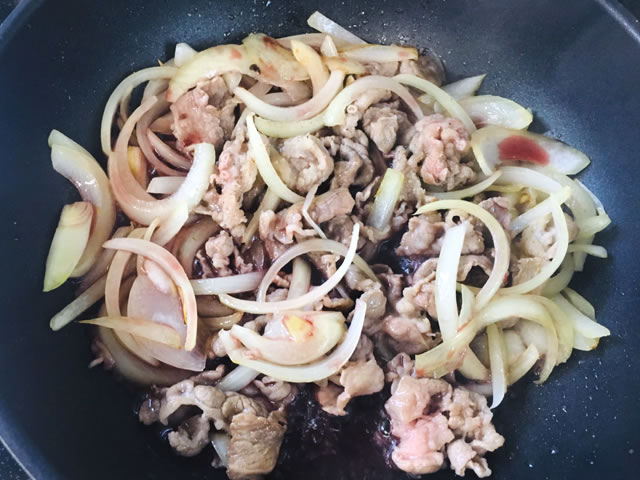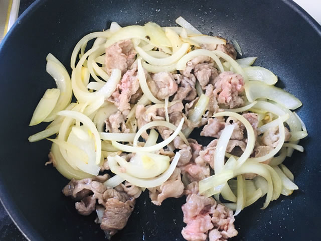 玉ねぎがしんなりしてきたらお肉を入れて炒め、火が通ったら塩コショウを少々振ります。