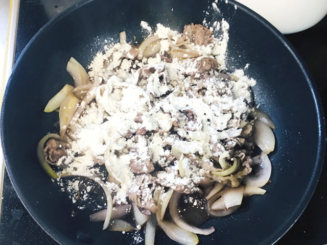 火を弱めてから、全体にふりかけをかけるように薄力粉を振り、炒めた具材に薄力粉を絡めて馴染ませます。
