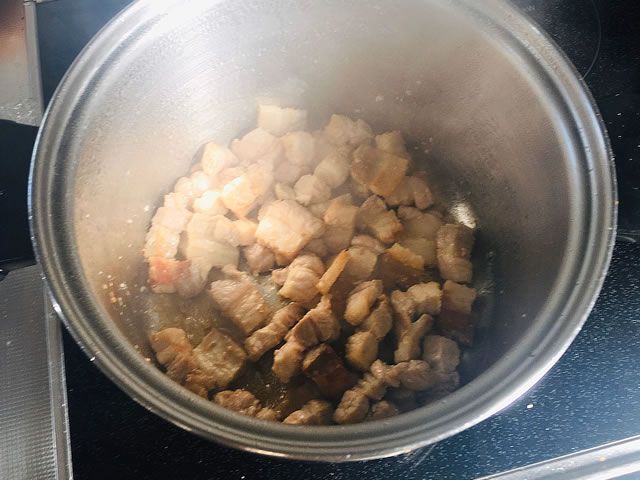 豚バラ肉に完全に火が通るまで炒めましょう。