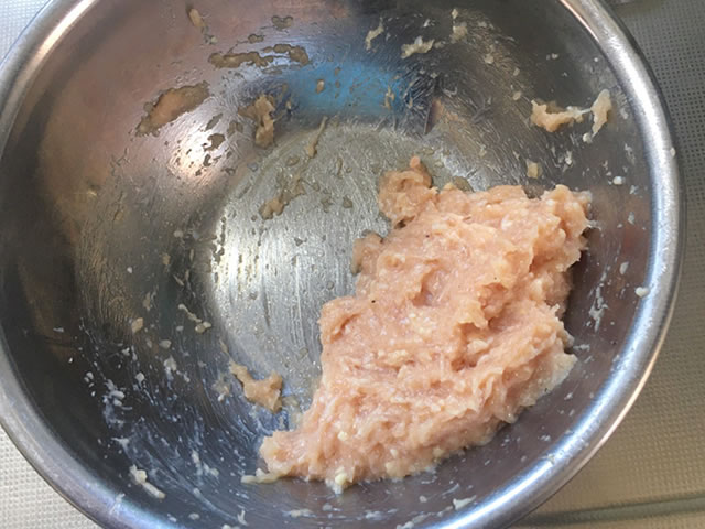 ボールに鶏ひき肉、塩麹(または味噌)、生姜を入れて混ぜておきます。
