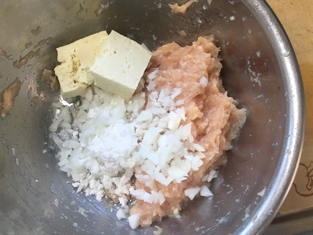 粘りが出てきたら水切りした豆腐、玉ねぎ、片栗粉、ゴマ油を入れてさらに練ります。