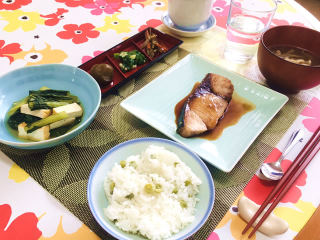 この日のごはんは豆ごはん、厚揚げと青菜の煮物。