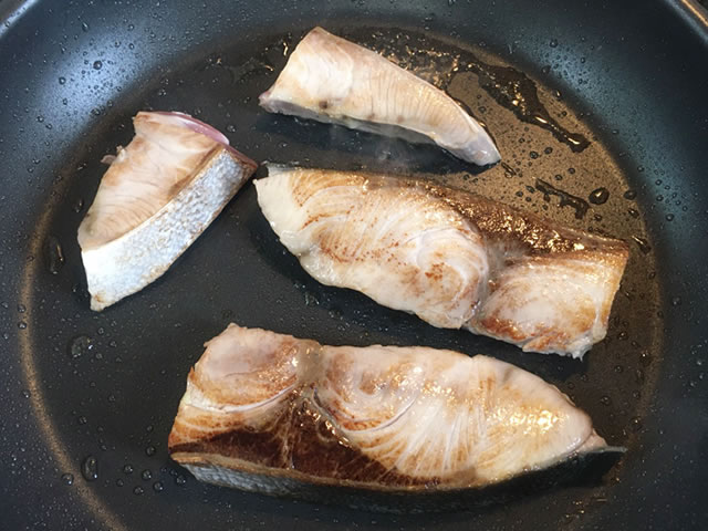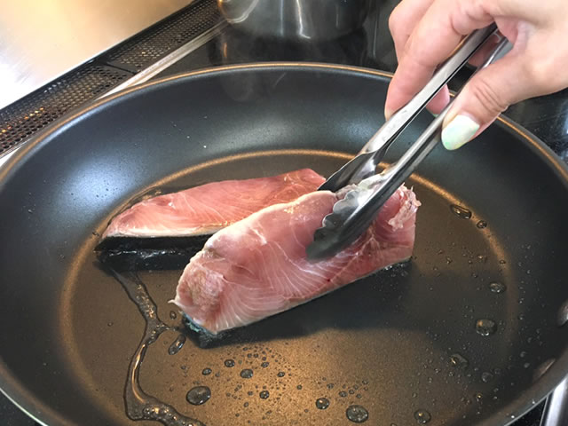 フライパンにサラダ油を引き、弱めの中火で熱して、ブリをトンクなどではさみ、皮目をフライパンに当ててこんがりするまで2分ほど焼きます。